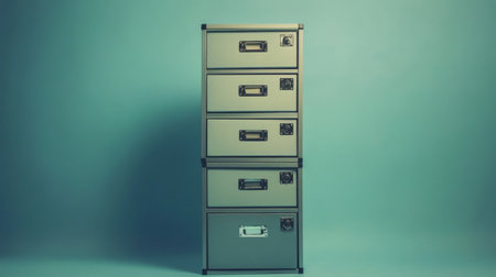 This vintage green filing cabinet showcases five neatly arranged drawers against a soft blue background, perfect for retro-inspired office decor.