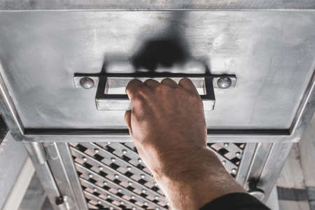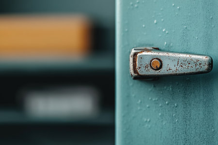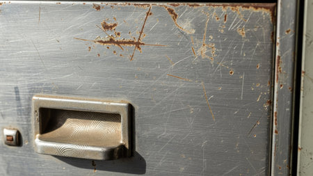 This image showcases a close-up of a metallic surface. The weathered texture exhibits rust, scratches, and a prominent handle. The composition is a detailed view, highlighting the aged appearance. This could be used for various projects needing textures or a vintage aesthetic, suitable for commercial or editorial applications.