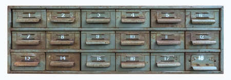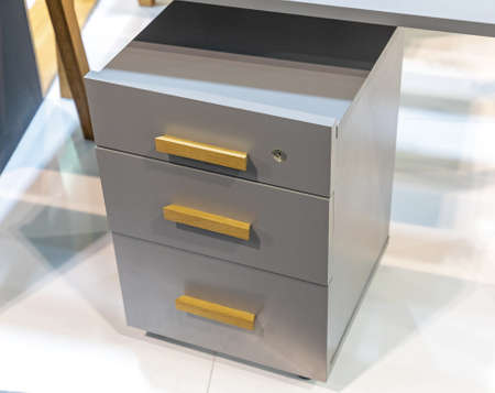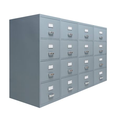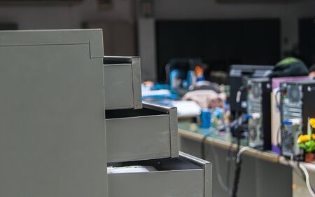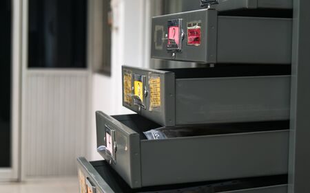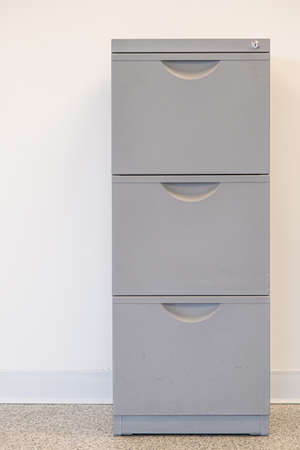File cabinet, office archive storage with drawers for documents, paper data, library or registry cards. Metal cabinet for paperwork organization