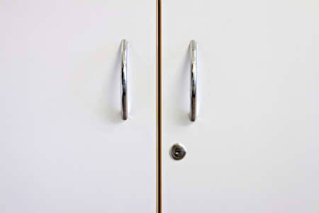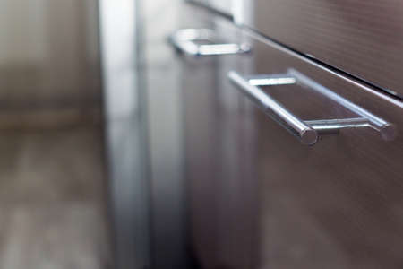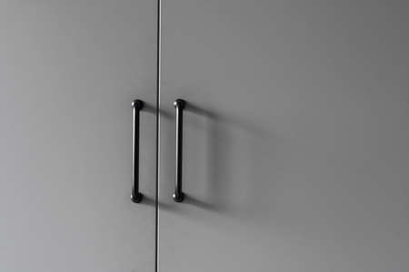 closed gray doors on modern wardrobe with wooden facade and black metal handles in living room, closeup