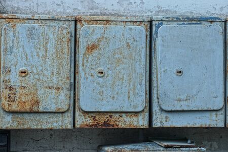 a row of three old gray iron mailboxes in rust on a wall on a street