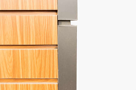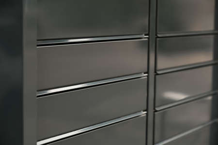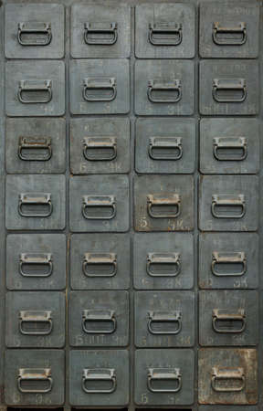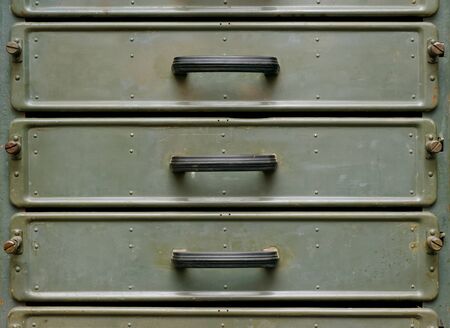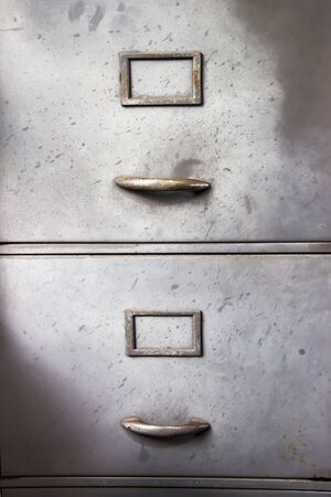 Backgrounds and textures: old gray metal cabinet with drawers, front view, close-up shot