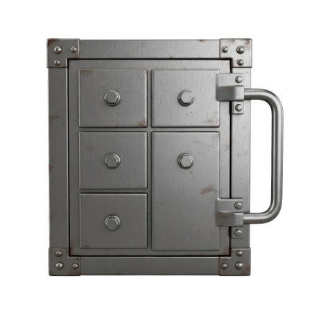 A detailed close-up shot of a small, industrial-style strongbox or storage unit, rendered against a clean white background. The unit features a distressed, grey metallic finish with visible rivets and structural elements on the corners. The strongbox is divided into two sections: the left side contains four small drawers stacked vertically, each with a simple round pull knob. The right side features a single hinged door secured by a prominent latch mechanism and a large, thick U-shaped handle, suggesting robust security and vintage industrial design.