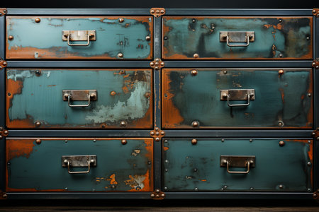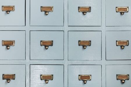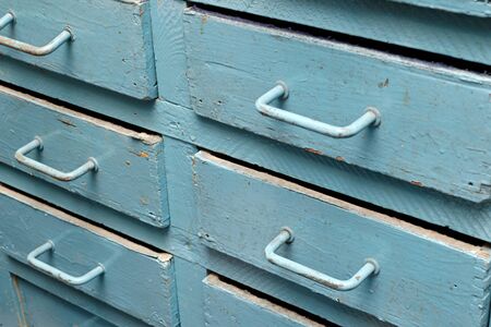 Backgrounds and textures: old blue wooden closet with drawers, close-up shot