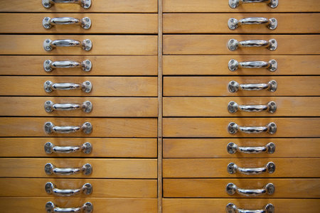 Neatly arranged drawers stacked on top of each other in a row, A row of file cabinets with neatly labeled drawers