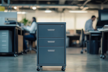 Gray metal file cabinet on wheels in an office with blurred workers and soft daylight atmosphere