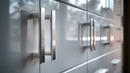 A close-up view of sleek modern cabinet handles on glossy white kitchen cabinetry. Subtle reflections and natural light enhance the elegant design and contemporary feel.