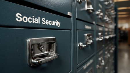 A row of blue filing cabinets with a sign that says Social Security on the front. The cabinets are full of files and the sign is in white