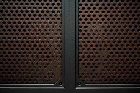 Textured dark metal panels with seamless joints on a futuristic building surface, emphasizing industrial design