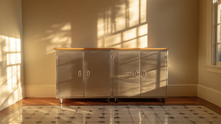 A sleek modern cabinet highlights minimalist design in a sunlit kitchen, with wooden top and metallic finish casting beautiful shadows on tiled flooring.