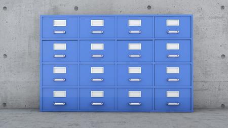 Filing cabinet, document collectors, metal cabinet with drawers and labels. 3d rendering