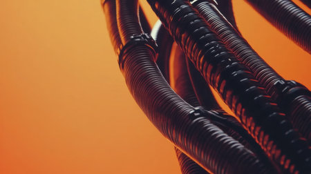 This close-up image presents a creative perspective of dark flexible hoses intertwined against a warm orange background, ideal for various design projects.