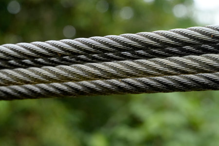 This close-up image showcases a twisted metallic steel wire rope, highlighting its durable texture and intricate design against a softly blurred background.