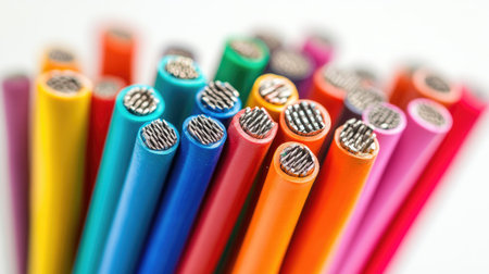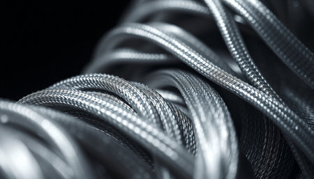 A close-up view of coiled electrical wires featuring copper conductors, showcasing industrial design and modern technology in an abstract setting.