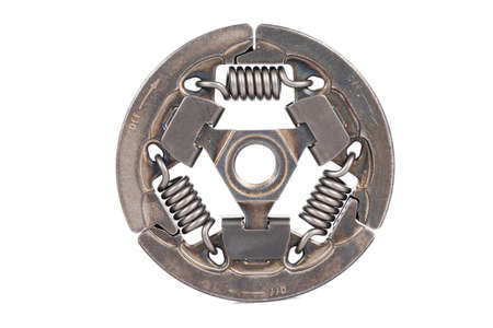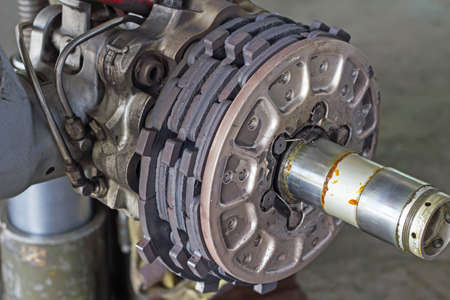 Clutch Cover expire on background gear transmission.Old Metallic clutch on Truck clutch system