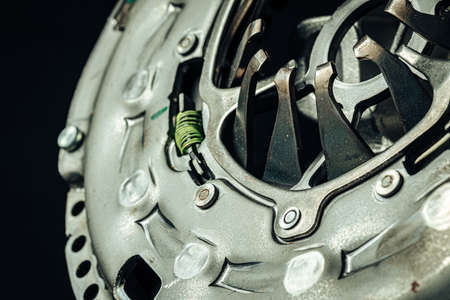 Close-up clutch disc of a car lies on metal parts contrast shot
