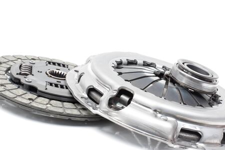 A new set of replacement automotive clutch on a white background. Disc and clutch basket with release bearing