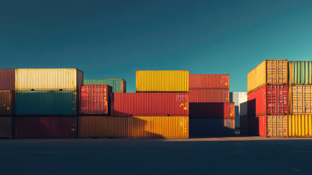 Stacked shipping containers in various colors with dramatic evening lighting and long shadows on the ground.