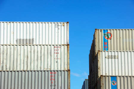 Cargo containers stacked in a large container terminal. Industrial background.