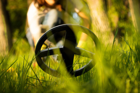 metal detector coil among the grass