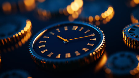 A close up view of vintage clock with Roman numerals, surrounded by gears, showcasing steampunk aesthetic. warm glow of clock highlights intricate details and craftsmanship