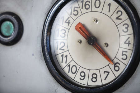 Close up of the dial of a vintage gas gauge with the number of hours