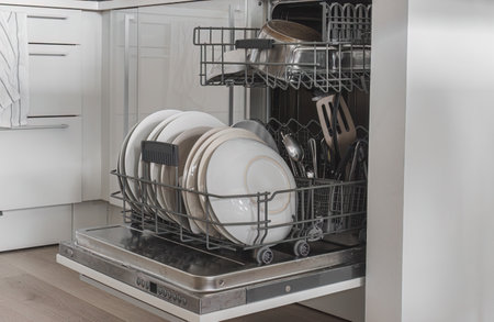 Modern kitchen dishwasher with white dishes for electronic washing device in stylish setting