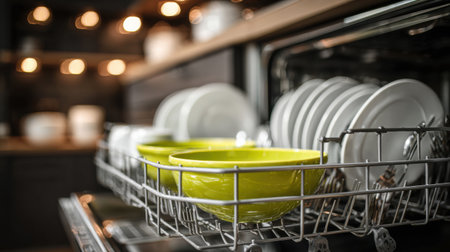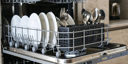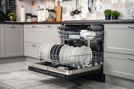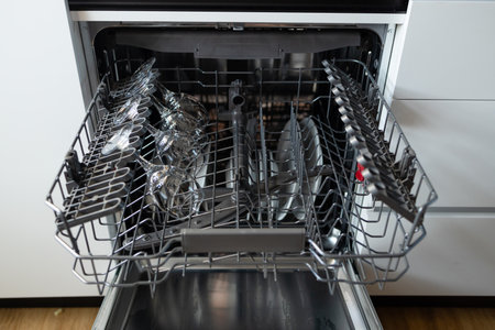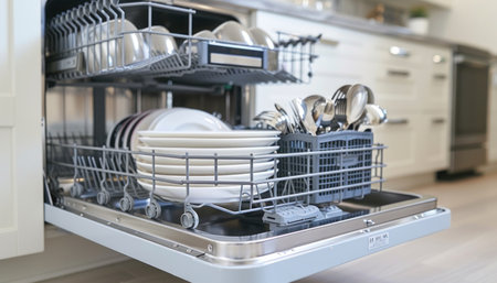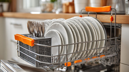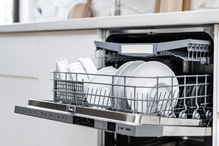 A sleek and modern dishwasher with an open door reveals sparkling clean dishes and utensils, showcasing effective design for optimal kitchen organization and efficiency.