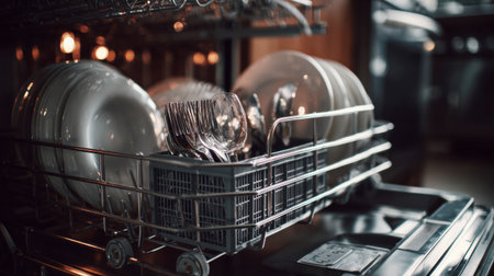 A modern dishwasher filled with neatly arranged clean dishes and silverware shines under bright lights in a stylish kitchen. Ideal for images showcasing convenience and home efficiency.