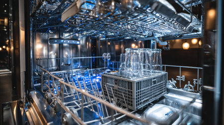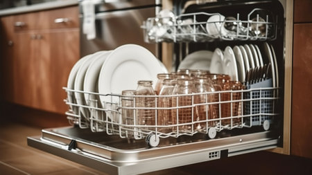 Modern dishwasher with clean glasses and tableware inside. Efficient household appliance for easy dishwashing, ensuring hygiene and convenience. Eco-friendly technology saving time, water, and energy in the kitchen.