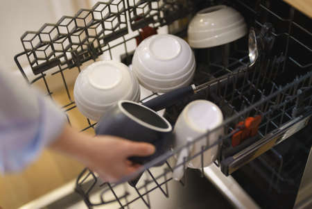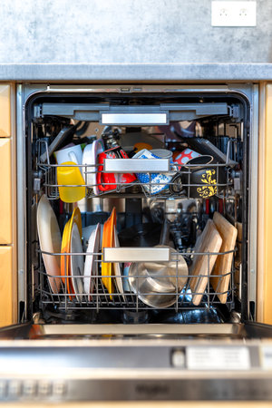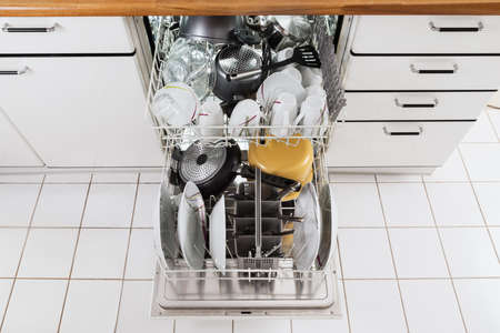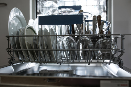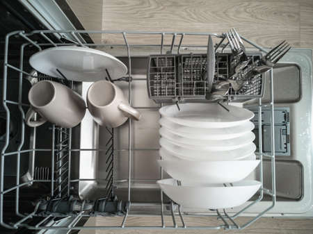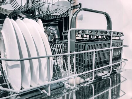 Modern kitchen with white used dishes ready to be washed in electronic dishwasher appliance
