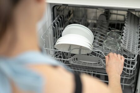 High angle view of woman opening modern dishwasher machine with plates and cups, standing on kitchen