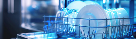 Open dishwasher with clean dishes, focus on modern kitchen appliance, blue-toned light.
