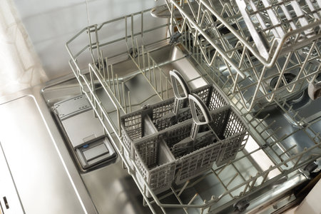 open stainless steel door of empty and clean dishwasher with pulled out rack trays with plastic cutlery basket in a white kitchen. Elevated view.