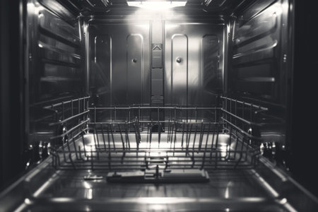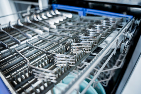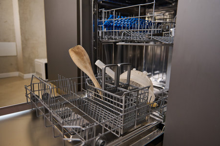 Close-up view of an open empty automatic dishwasher in kitchen. Modern kitchen appliance. Housekeeping equipment, Household chores.