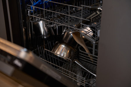 Front view of open automatic stainless fully integrated dishwasher range machine with clean utensils, cutlery, inside at modern home kitchen. Household domestic, kitchen appliances, lifestyle view