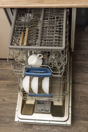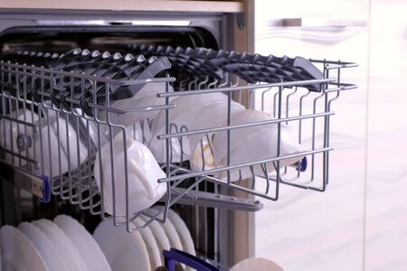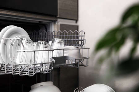 Open door of built-in dishwasher with clean plates and dishes at kitchen. Housework