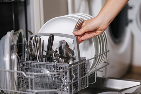 Female hand removing clean fork from a loaded dishwasher. Background of open wash machine