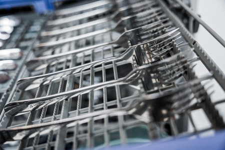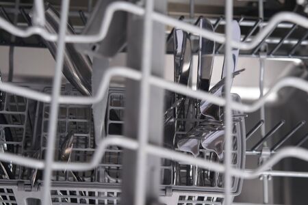 clean dry forks and spoons in an open dishwasher closeup. cutlery compartment close-up. household appliances in the kitchen.
