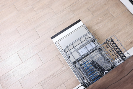 Open clean empty dishwasher in kitchen, top view. Space for text