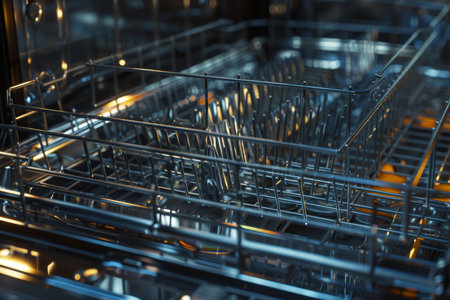 empty open dishwasher closeup. cutlery compartment close-up. household appliances in the kitchen macro.