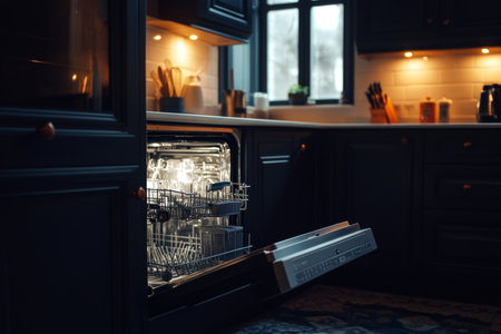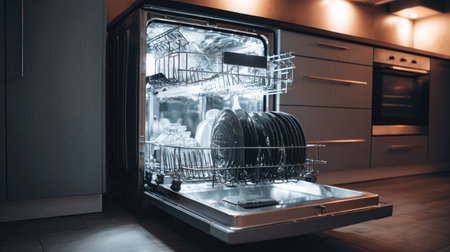 In a stylish kitchen, a modern dishwasher displays clean dishes and silverware, highlighting efficient household cleaning and organization at night.