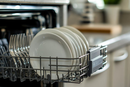A modern dishwasher displaying freshly cleaned white dinner plates, highlighting a tidy kitchen space that reflects warmth and practical design for everyday meal preparation.