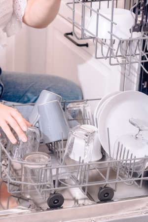 Built-in dishwasher, dishwashing. A woman loads washed dishes, cups, glasses. A woman's gentle hand puts something in the dishwasher or pulls out, unloads.