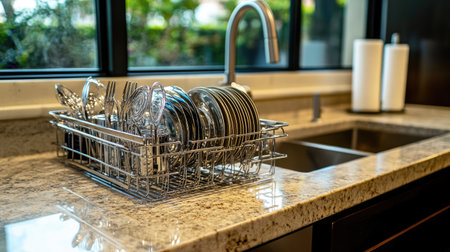 A well-organized kitchen sink area showcasing a stainless steel dish rack filled with clean plates, glasses, and utensils. The modern design exudes a fresh and tidy atmosphere ideal for cooking and home life.