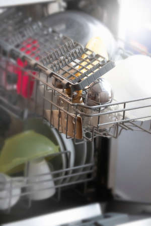 Dishwasher with clean utensils in modern kitchen interior.