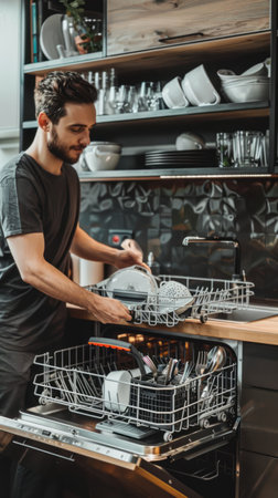 A man carefully fills the dishwasher with dirty dishes, organizing them neatly to ensure a thorough clean