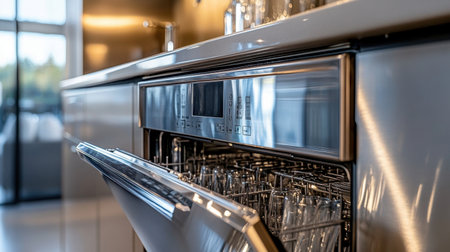 Dishwasher door is open, displaying sparkling clean dishes and glimmering stainless steel details, with steam rising gently.