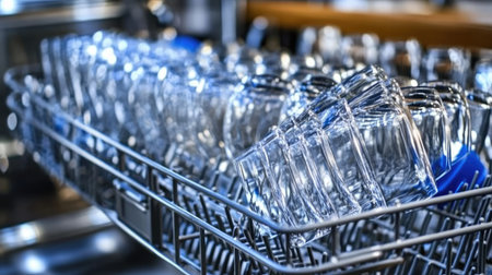 Sparkling glassware sits neatly in a modern dishwasher, showing an efficient kitchen design and cleanliness focus.