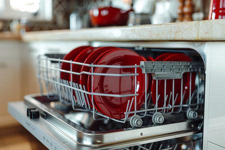 Dishwasher inside beautiful kitchen with red used dishes that prepared to wash